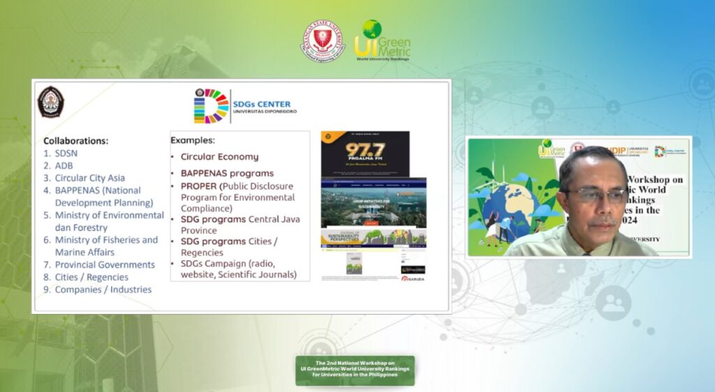 The conversation progressed with several enriching sessions, divided into three segments, featuring prominent speakers from UI GreenMetric and representatives from universities in the Philippines such as Saint Louis University, West Visayas State University, Mariano Marcos State University, Central Philippines State University, and De La Salle University.