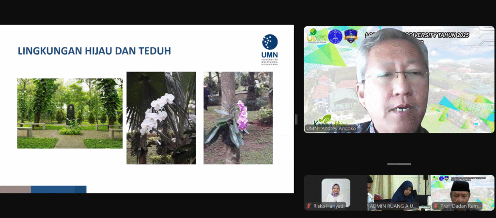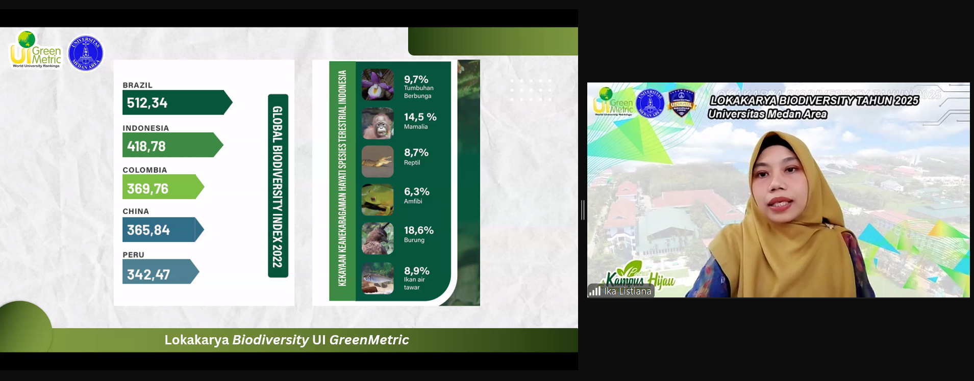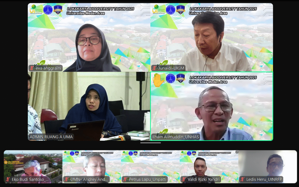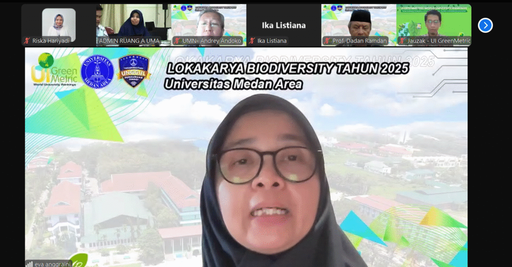On Wednesday, 28 May 2025, the University of Medan Area (UMA), in collaboration with UI GreenMetric, successfully held the Biodiversity Workshop 2025 under the theme “Doing SDGs in Higher Education: The Story of Our Institution and Society.” The online event gathered around 130 participants from universities across Indonesia, creating a dynamic platform for dialogue and knowledge exchange on the role of higher education institutions in promoting sustainable development—particularly in the field of biodiversity.