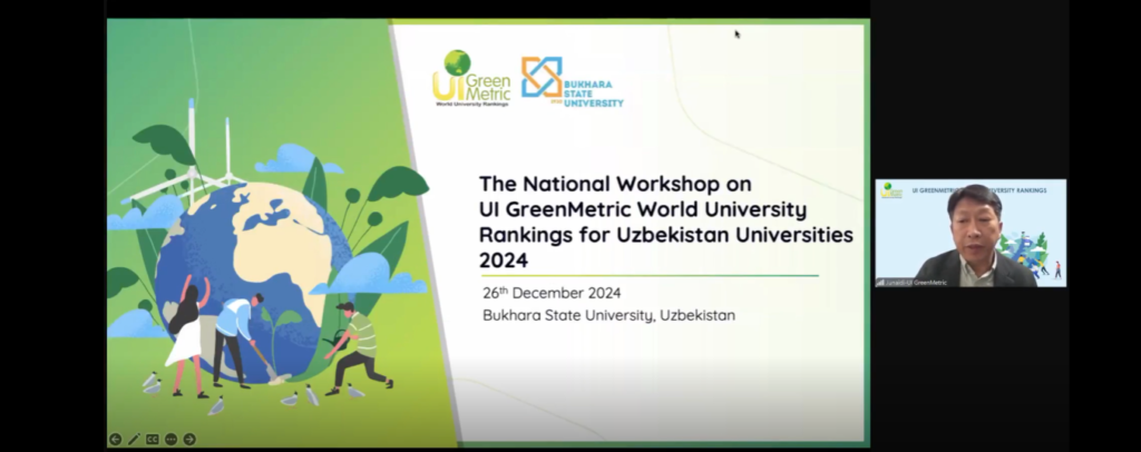 On December 26, 2024, Bukhara State University hosted the 2nd National Workshop on UI GreenMetric for Higher Education in Uzbekistan, a virtual event that highlighted the growing commitment of academic institutions to sustainability. This workshop aimed to enhance awareness and encourage the adoption of best practices in line with the UI GreenMetric methodology, uniting universities across Uzbekistan in a shared mission to integrate sustainable development into their operations and policies.