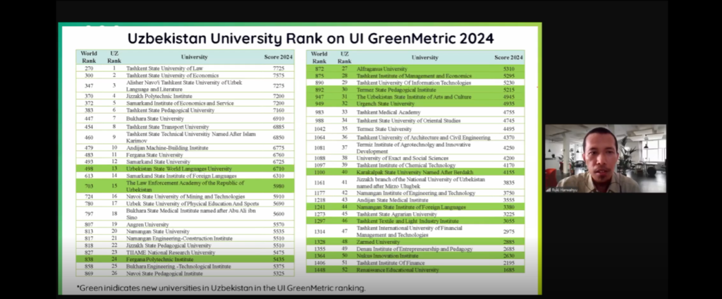 These key figures underscored the importance of aligning higher education institutions with global sustainability goals, providing valuable insights into the UI GreenMetric framework and its potential impact on sustainability efforts in Uzbekistan.