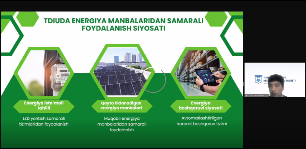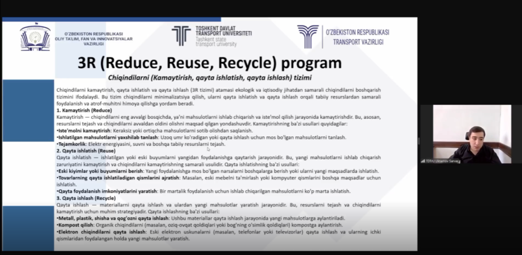 A central part of the workshop was the series of presentations by leading Uzbek universities, where each institution showcased its efforts to integrate sustainable practices based on the six core indicators of the UI GreenMetric methodology: Setting and Infrastructure, Energy and Climate Change, Waste, Water, Transportation, and Education and Research. For example, one university highlighted its eco-friendly campus planning with energy-efficient buildings, while another presented its strategies for reducing carbon emissions and utilizing renewable energy systems. Several universities also discussed initiatives in waste reduction, water conservation, green transportation, and fostering environmental awareness through research and education.