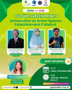 On October 18th, 2024, the conversation about creating sustainable campuses moved forward once again. Through an Instagram Live session, UI GreenMetric presented the theme “Future Greenprints: Universities as Green Spaces Establishment Catalysts.” This IG Live discussion was a collaboration between Universitas Multimedia Nusantara, Telkom University, and Universitas Teuku Umar, featuring a panel of experts sharing strategies for universities to drive green space development.