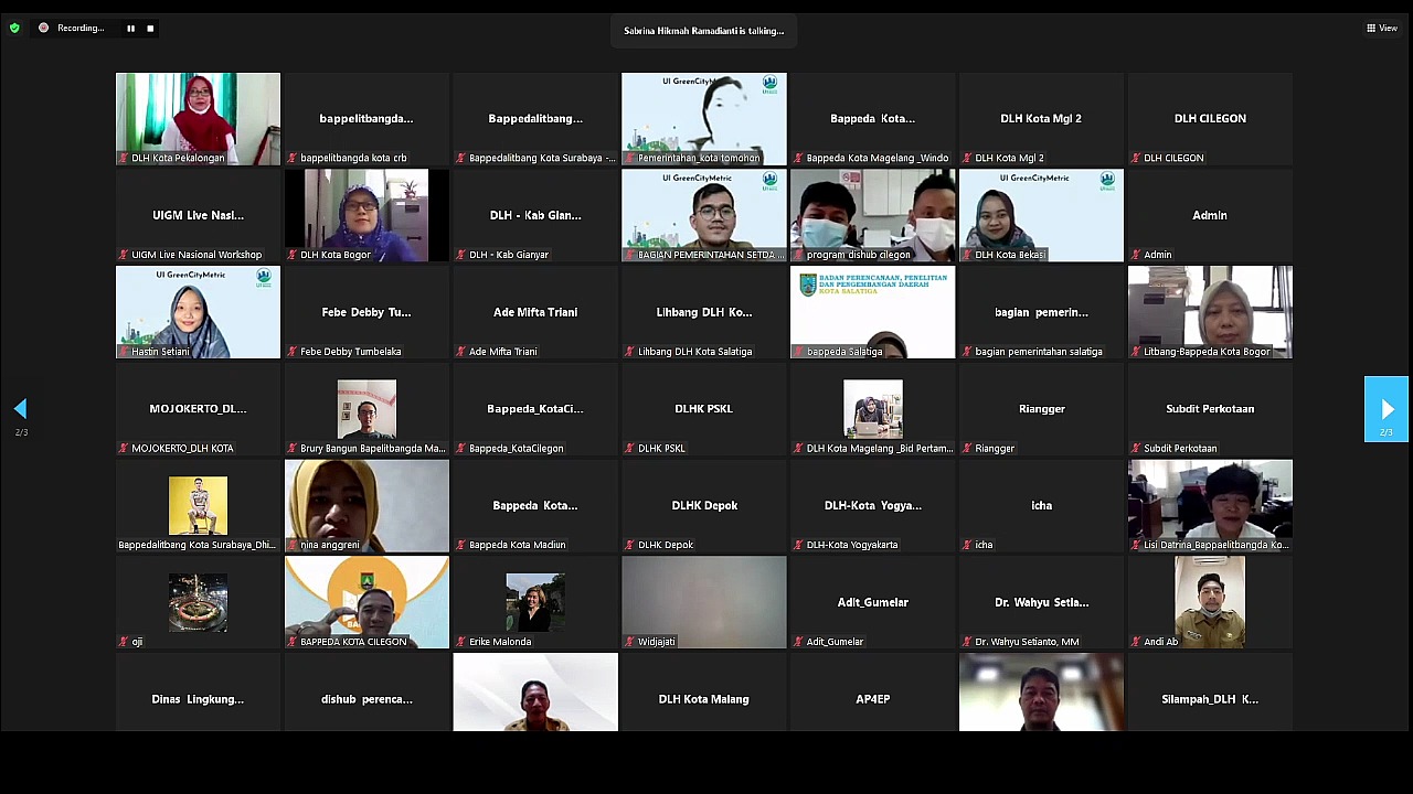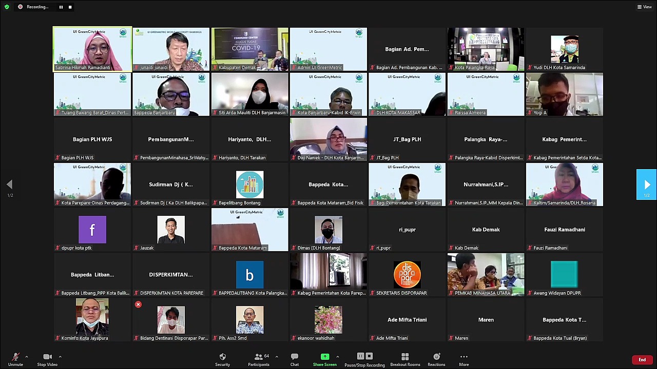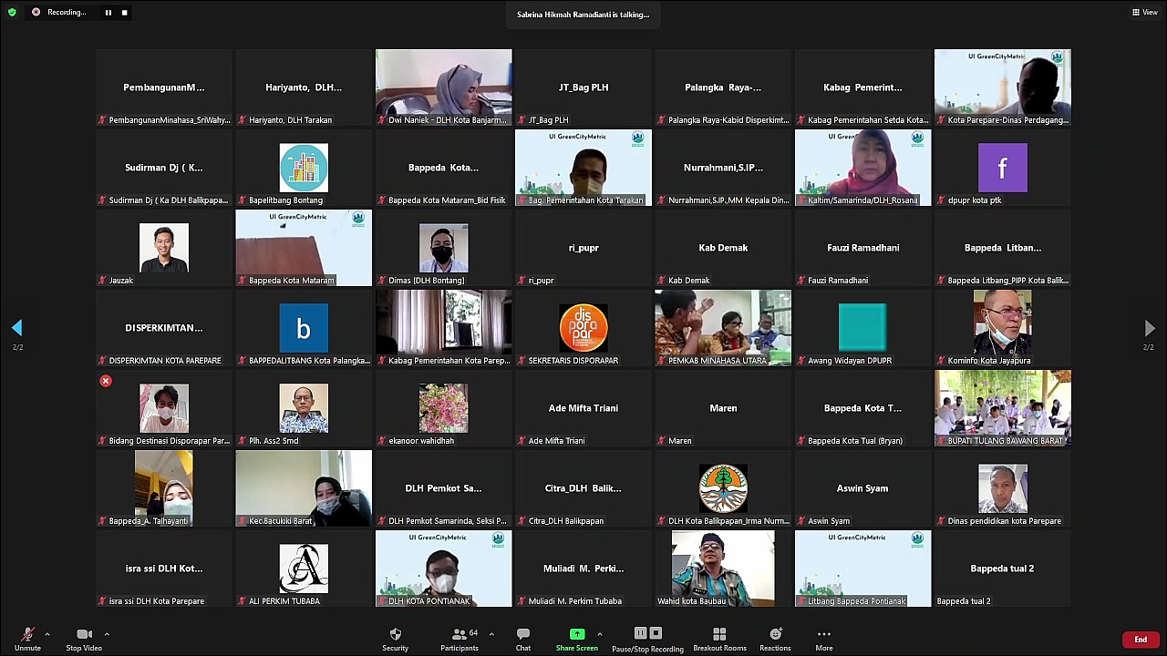 In her speech, Prof. Dr. Ir. Riri Fitri Sari, M.M., M.Sc, stated that the UI GreenCityMetric event to Regencies/Cities was based on the background that for 12 years UI GreenMetric had ramkes, ranking universities in the world in terms of sustainability. The GreenMetric network impact in which everyone have the opportunity to learn and share their experience. It is seen that the leadership continues to monitor the development and implementation of the categories and six indicators in UI GreenMetric. So, for Indonesia, we think this is the best moment for us to learn together based on the international standards we have previously established to create smart, resilient, sustainable cities capable of providing support for good health and prosperity for all. With this background, we hope that all can create environmentally friendly and responsible cities to ensure that everyone can follow the latest standards in realizing prosperity and sustainable development goals that can be recognized by empowering smart cities, responsible and resilient cities. "Hopefully, with today's event and discussion sessions, it will eventually lead to the realization of all of our collaborations to ensure and realize that our cities will become advanced, modern cities that we can pass on to our next generation in good condition and capable of supporting a decent and dignified life.” The participating 78 regencies/cities the event were divided into 3 days. The first day (January 25th, 2022) was attended by 32 regencies/cities consisting of 29 cities and 3 regencies, including Cilegon City; South Tangerang City; Yogyakarta City; Banjar City; Bekasi City; Bogor City; Cimahi City; Cirebon City; Depok City; Tasikmalaya City; Magelang City; Pekalongan City; Salatiga City; Semarang City; Surakarta City; Tegal City; Batu City; Blitar City; Kediri City; Madiun City; Malang City; Mojokerto City; Pasuruan City; Probolinggo City; City of Surabaya; Bitung City; Manado City; Tomohon City; Denpasar City; Badung Regency; Gianyar Regency and Tabanan Regency.