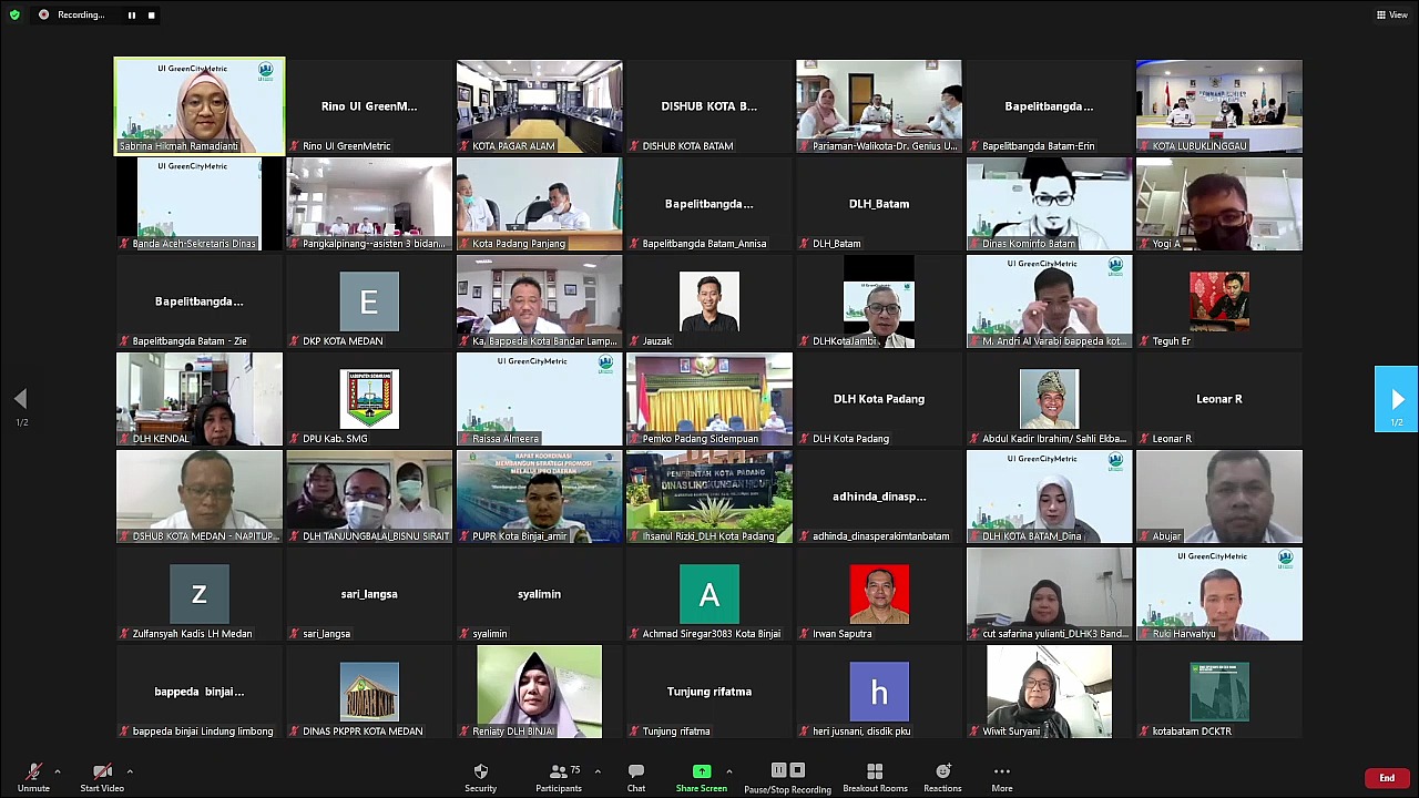 Therefore, UI GreenCityMetric created an event, "Information Session about UI GreenCityMetrics Rangkings for Regencies/Cities in Indonesia" from January 25th, 2022 to January 27th, 2022, virtually with a total of 78 participating regencies/cities in Indonesia during the three days event. The event was inaugurated with the opening remarks by Dr. Drs. Safrizal ZA., M.Si (Director General of Regional Administration of the Ministry of Home Affairs) and Prof. Dr. Ir. Riri Fitri Sari, M.M., M.Sc, (Chairperson of UI GreenMetric).