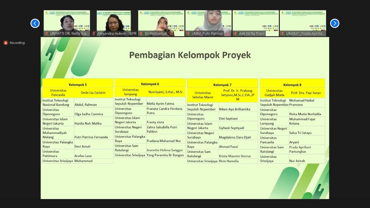The opening session for this online course was held on Thursday, 8 September 2022 at 14.00 WIB through zoom meeting. The online course was started with welcome remarks from Prof. Dr. Ir. Riri Fitri Sari as the Chairperson of UI GreenMetric. She said, “Having a goal to be able to achieve a common goal to learn best practices and put them into practice immediately to create a better Indonesian economy in the future that helps us and achieve the top six ranking for the world's economy by 2045”. The opening remark was then followed by Prof. Dr. Ir Ambariyanto MSc. As the National Coordinator of UI GreenMetric World University Rankings Network (UIGWURN) for Universities in Indonesia. Prof. Ambariyanto mentioned, “Online course activities have tried to run and provide experience for students to have an experience in a period of education outside the study program. Together with the presence of the SDGs, we must move together to achieve common goals and for students to be able to play an active role in implementing the SDGs and be able to expand the networking of students” and continued by Remarks from Rectors and Vice Rector from 13 Universities. In the next session, Dr. Junaidi, M.A., as Vice-Chair of Program, Communication, and Partnership explained the Lecture Session that all the participants will join in the next few meetings, by explaining the module and the schedule of each session. All the participants are grouped into 12 groups.