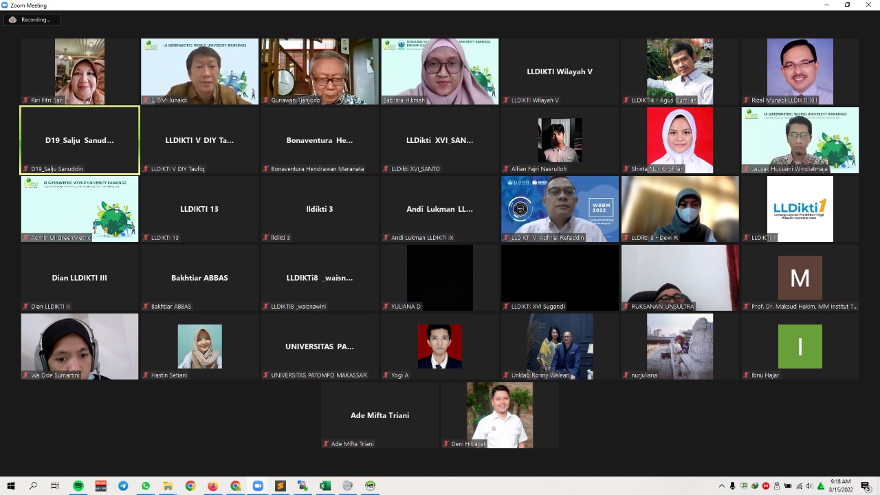 The UI GreenMetric World University Rankings Socialization for LLDIKTI III Indonesia was held on Monday 15 August 2022 at 08.00 WIB via Zoom meeting. This socialization also invited the Heads of LLDIKTI throughout Indonesia. The aim of this event was to spread the “virus” of sustainability throughout Indonesia in universities. Meanwhile, the agenda of this socialization event was to introduce UI GreenMetric and UI GreenCity Metric, which was followed by a discussion session.