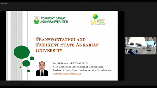 Dr. Abduaziz Abduvasikov, Vice Rector of Tashkent State Agrarian University, followed with a presentation on his university. He provided an overview of its history, development, and efforts in achieving sustainability. Dr. Abduvasikov also explained the transportation solutions implemented at his university and presented the results of these initiatives.