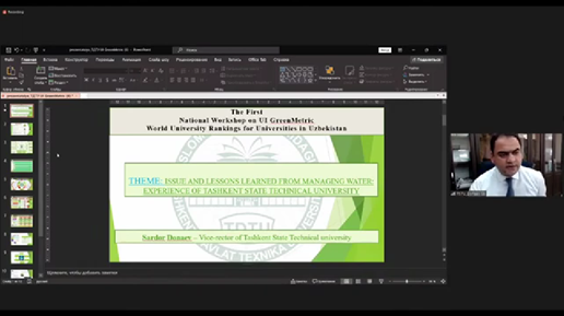 The presentations proceeded with Sardor Donaev, Vice Rector of Tashkent Technical University, who introduced his university, highlighted its educational initiatives and programs, discussed Tashkent Technical University's performance in UI GreenMetric rankings, and shared valuable lessons learned, practices, and suggestions for managing water in the university.