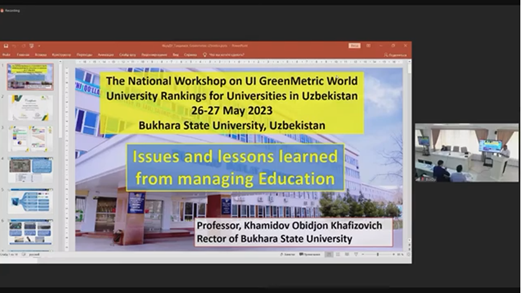 The first day of the workshop commenced at 9:00 AM (GMT+5) with an opening address by Abror Juraev, Vice Rector for International Cooperation of Bukhara State University. He warmly welcomed all the participants and introduced the speakers from UI GreenMetric. The session began with a video profile showcasing Bukhara State University and UI GreenMetric.