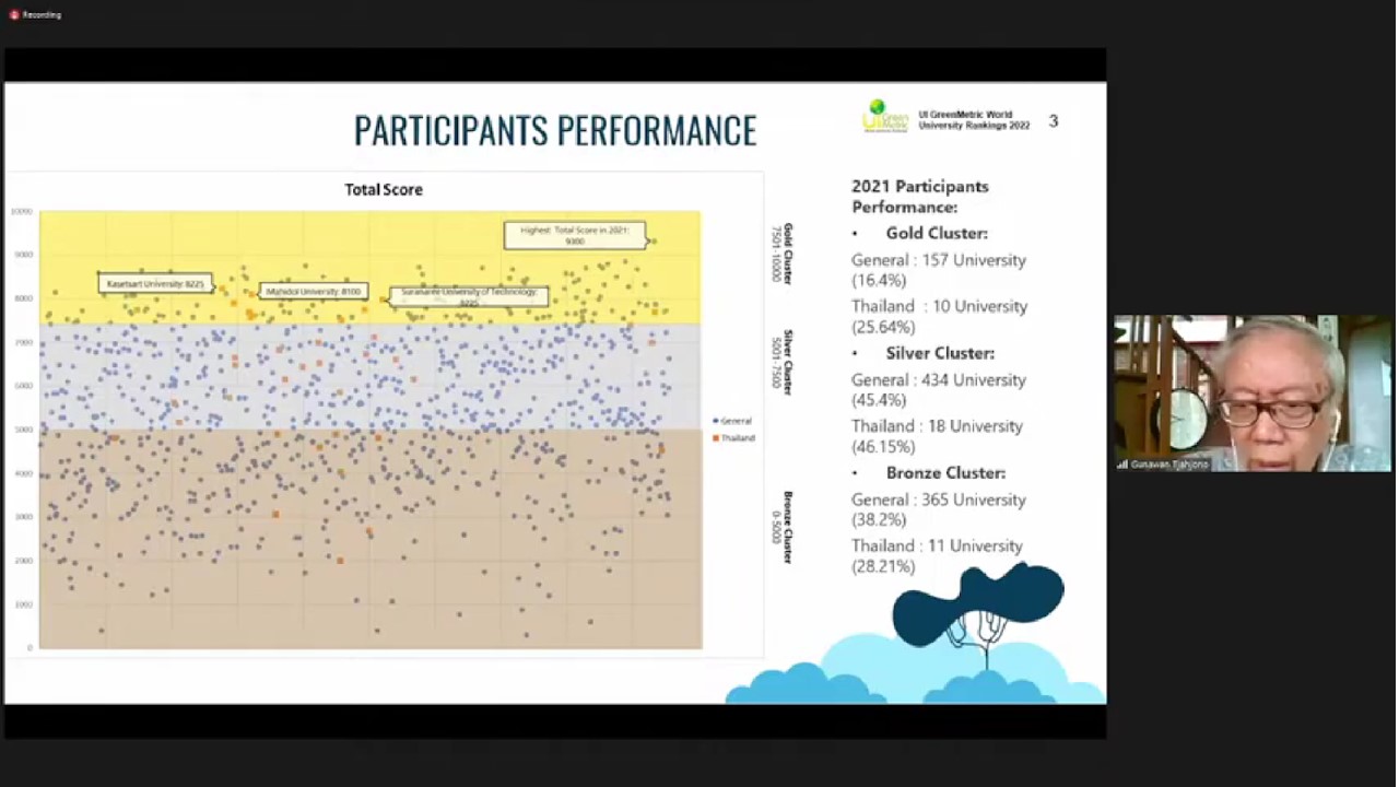 Next, the presentation of UI GreenMetric indicators and data process submission was delivered by UI GreenMetric Expert Member of Research and Development Prof. Ir. Gunawan Tjahjono, M.Arch., Ph.D. The first topic is the performance report of participating universities in 2021. The performance is divided into 3 categories sorted from the best to least best, which include gold, silver, and bronze. From the ranking, universities in Thailand are doing great in UI GreenMetric University Ranking. Next, the indicators of UI GreenMetric are improving yearly and universities in Thailand are doing well in each indicator.