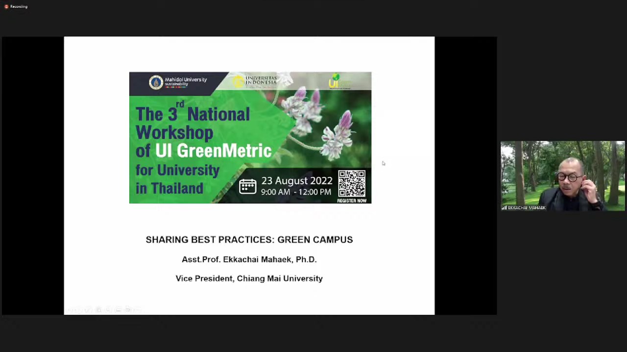 The opening speech was delivered by Associate Professor Kitikorn Charmondusit, Ph.D. “UI GreenMetric World University Ranking was conducted by Universitas Indonesia which has been a member of the international ranking expert group since 2010. This ranking uses 6 environmental indicators to observe the current green and sustainable policy and to support the development of policy to prevent climate change and affect environmental sustainability,” said the Associate Professor in his speech. “In 2021, there were 956 participating universities including 39 Thai universities. The ranking has motivated them to improve sustainability and environmental performance,” he added. The impacts of UI GreenMetric has become a driving force in initiating the National Workshop of UI GreenMetric for University in Thailand.