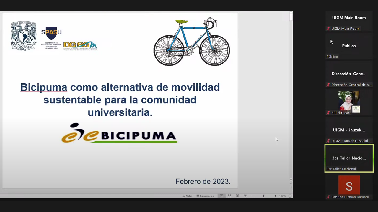 The second session was moderated by Biol Diana Osorio as Department of Sustainable Society, Directorate General of Community Concern of UNAM to discuss UNAM Sustainability Projects. The first speaker, Dr. María Alejandra Fonseca Salazar, as University Coordinator for Sustainability, Directorate General of Public Services and Mobility of UNAM explained UNAM environmental sustainability. She talked about various projects held by UNAM from 1982 until 2022 with every challenge of their project execution, formation of the la COUS (La Coordinación Universitaria para la Sustentabilidad) at UNAM, and the needs of UNAM to implement and manage their projects. The second speaker, Ing Luis Gutiérrez Padilla as Deputy Project Director for Safe and Sustainable Communities, Directorate General of Community Attention of UNAM explained about distinctions UNAM community, he shared about the bicycle community called Bicipuma as a sustainable mobility alternative for the university community and the collaborations. The third speaker, Dra. Nancy Merary Jiménez Martínez as Researcher of the University's Comprehensive Solid Waste Management Program with a Zero Waste Approach (MIRSU-B0), Regional Multidisciplinary Research Center, Morelos Campus of UNAM talked about her experience in the management of the comprehensive management program for university waste, zero waste, in Mexican Universities. She explained the strategy of comprehensive management and zero waste in the universities' scope, which are the separation scheme, the complete infrastructure, the processes, monitoring and evaluation, training, and resilience.