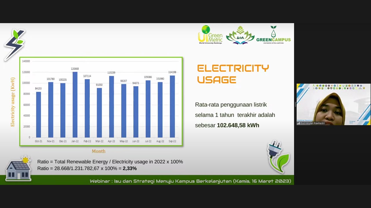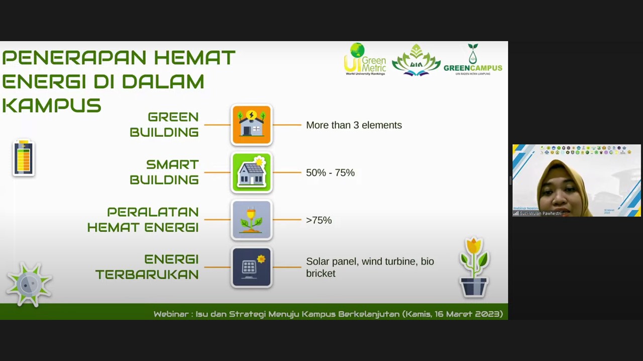 The third speaker, Suci Wulan Pawhestri M.Si presented the University’s efforts on energy efficiency. She shared the example of Raden Intan State Islamic University’s best practices on energy efficiency, such as the implementation of green buildings and smart buildings, energy-saving equipment, the utilization of sustainable energy, environmental management system, electricity usage, and carbon footprints.