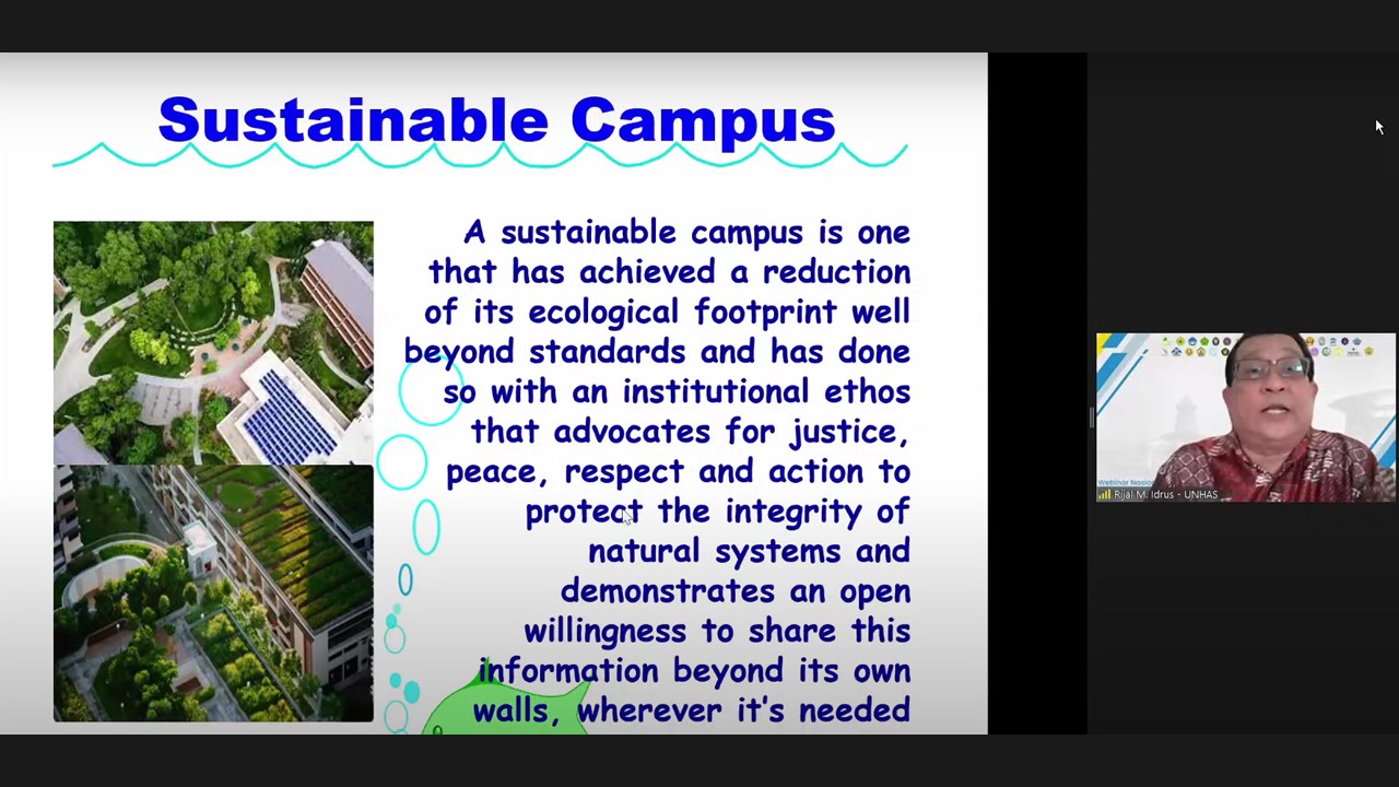 The first speaker, Dr. Ir. Rijal Idrus M. Sc. presented the issues and strategies for a sustainable campus. He started to explain the role and importance of academic research by universities about energy and climate change, key sustainability challenges and goals, the essential aspects to build a sustainable campus, the theory of change, the problems that occurred, and also the solutions. He added that to achieve a sustainable campus, we need to collaborate with several stakeholders/actors, such as citizens, government, the private sector, academics and researchers, and also media.