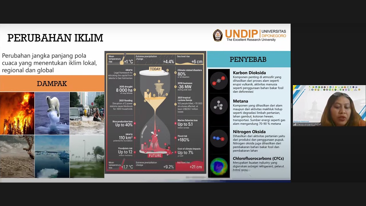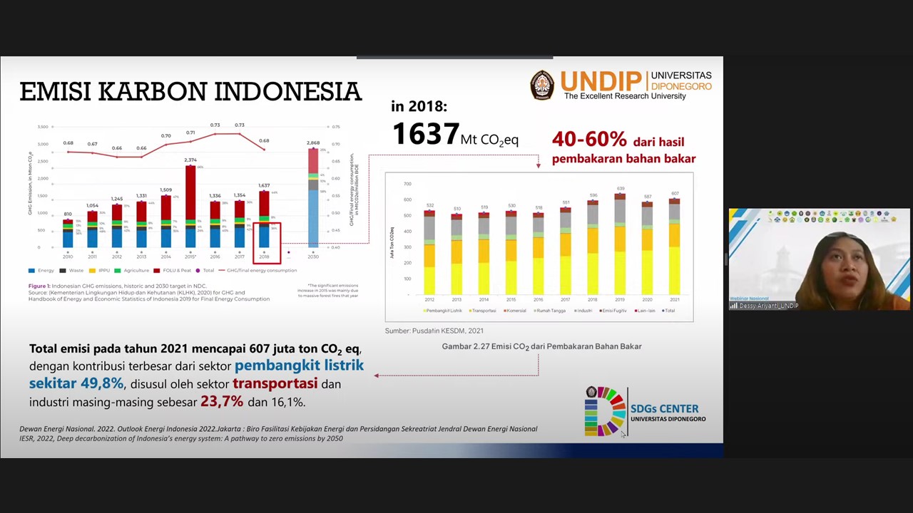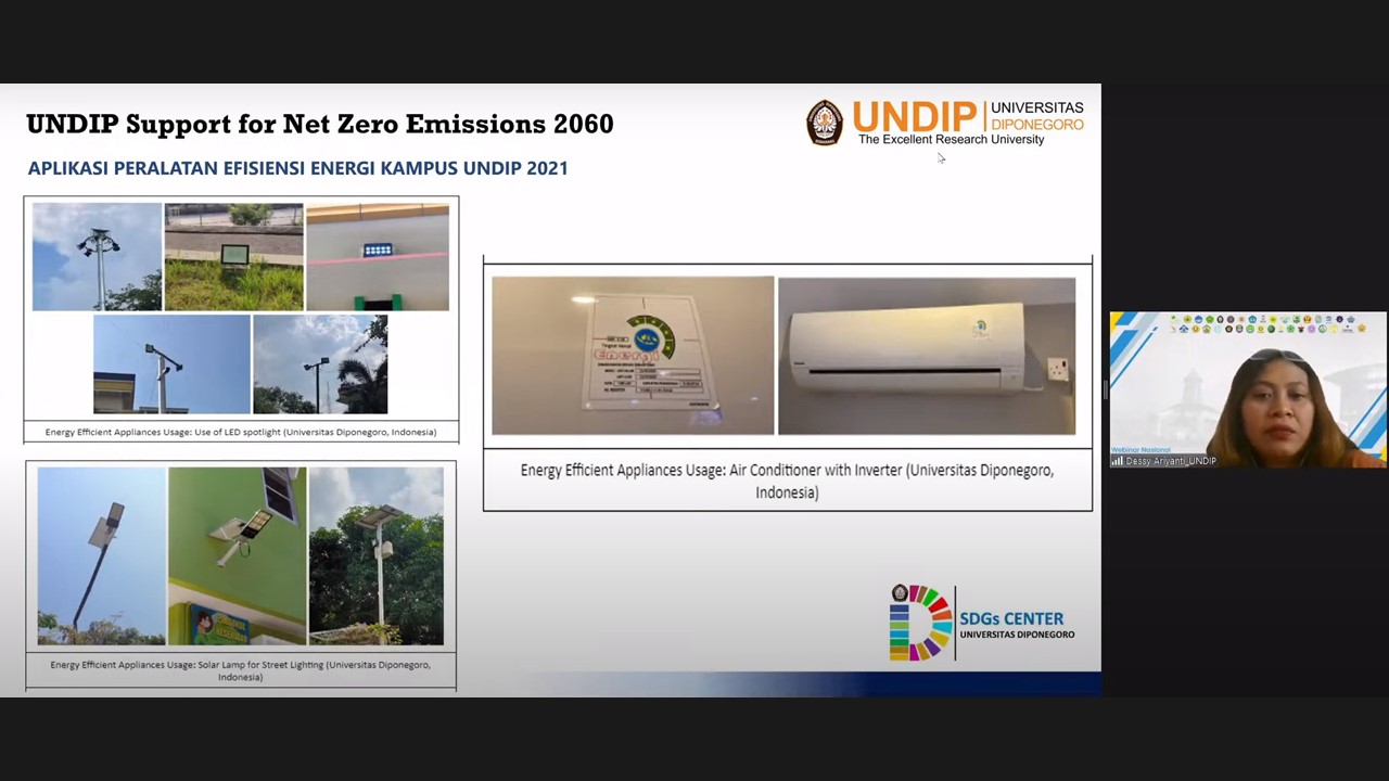 The second speaker, Dessy Aruyanti S.T., M.T., Ph.D. presented the role of universities in decreasing the impacts of climate change and achieving Indonesia’s Net Zero Emissions in 2060. She first explained the condition of climate change today and Indonesia’s carbon emission situation, followed by her explanation of Indonesia’s energy and transportation profile, the pathway of the university's role in supporting zero-emission, and she shared the actions of Diponogoro University to build a sustainable university.