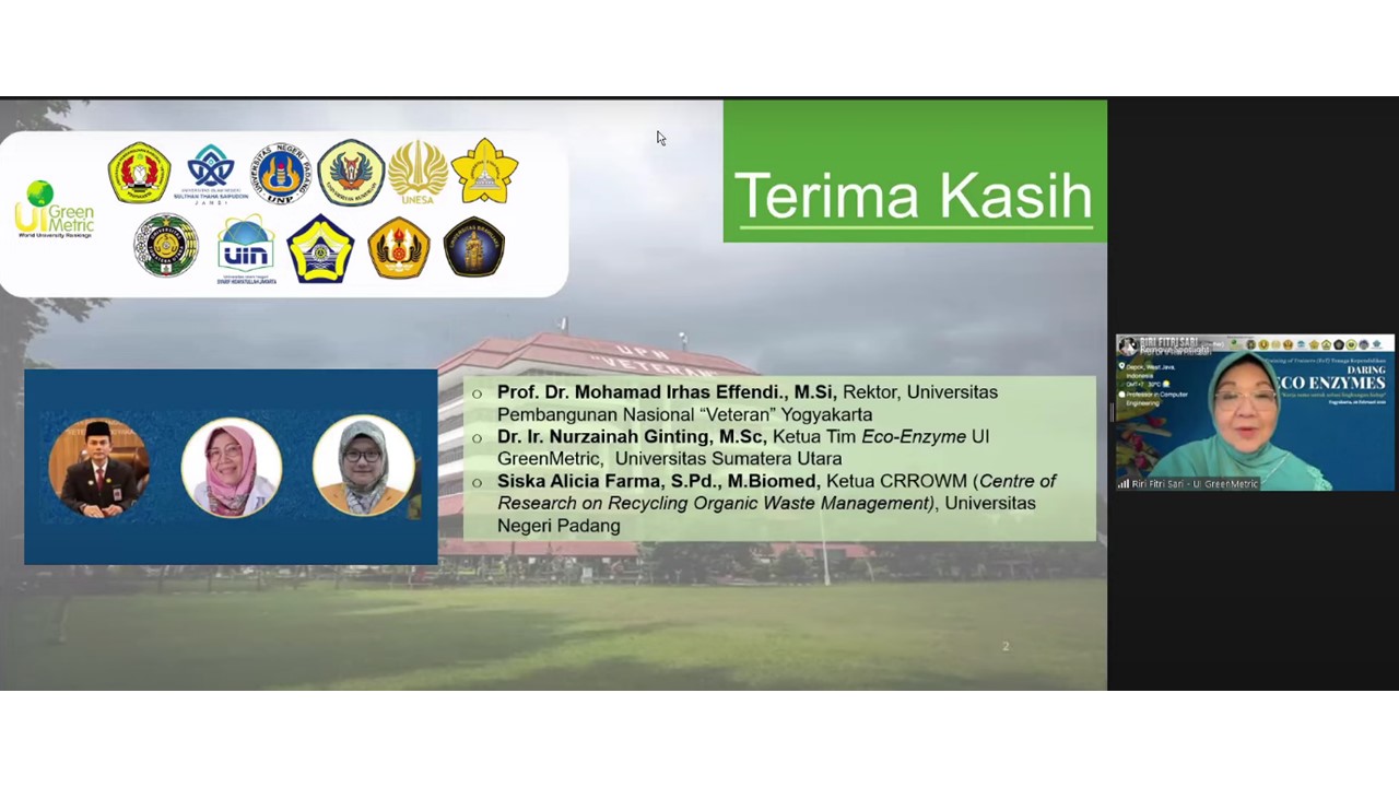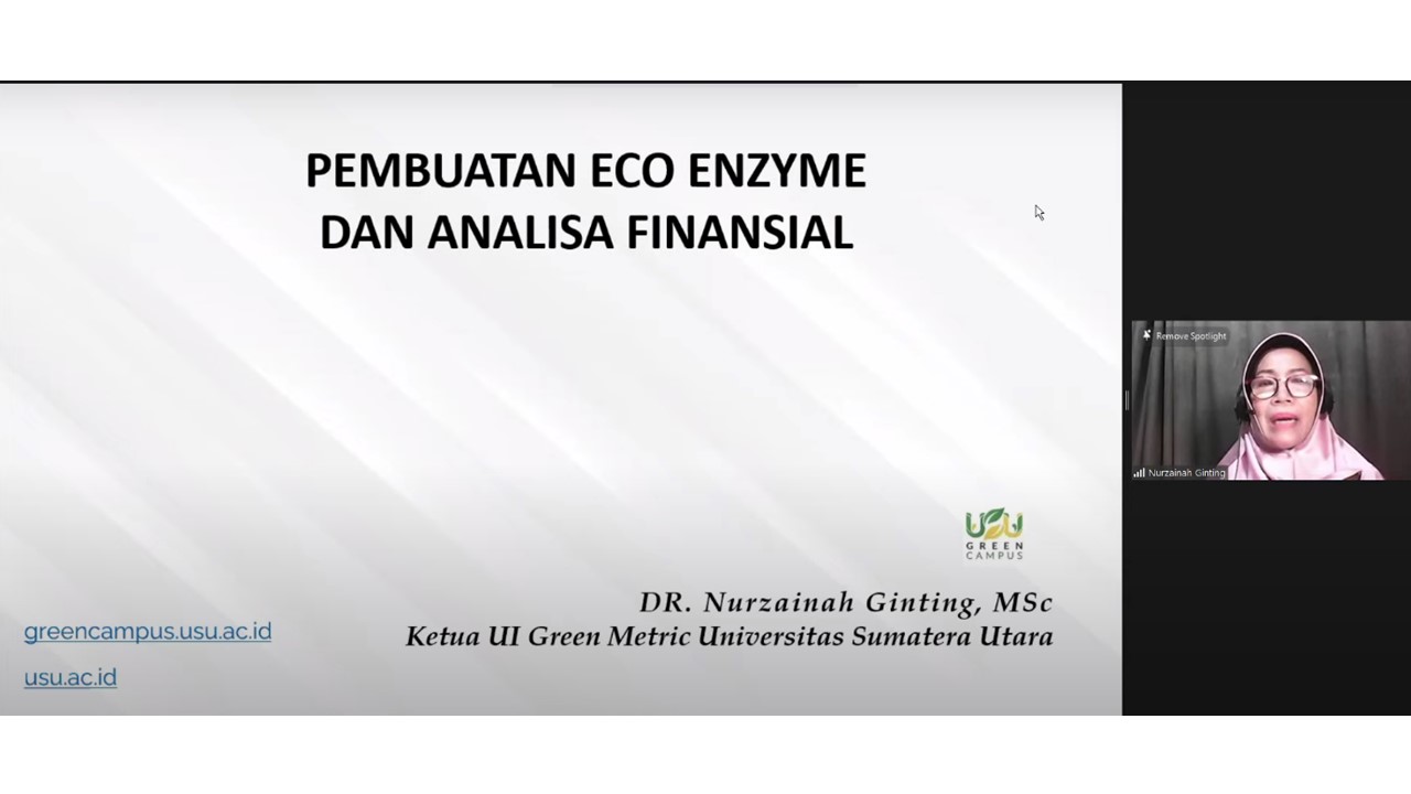 The first speaker, Dr. Ir. Nurzainah Ginting, M.Sc. presented about Eco-Enzyme Production along with Eco-Enzyme Financial Analysis. She explained the definition of eco-enzyme itself, processes and materials for eco-enzyme making, benefits of eco-enzyme. She also shared the financial analysis of eco-enzyme utilization. She hopes that each university can maximize the use of eco-enzymes in their respective environments.