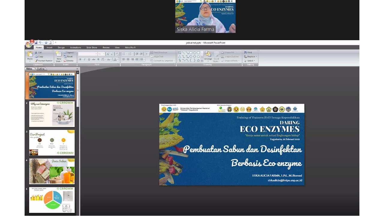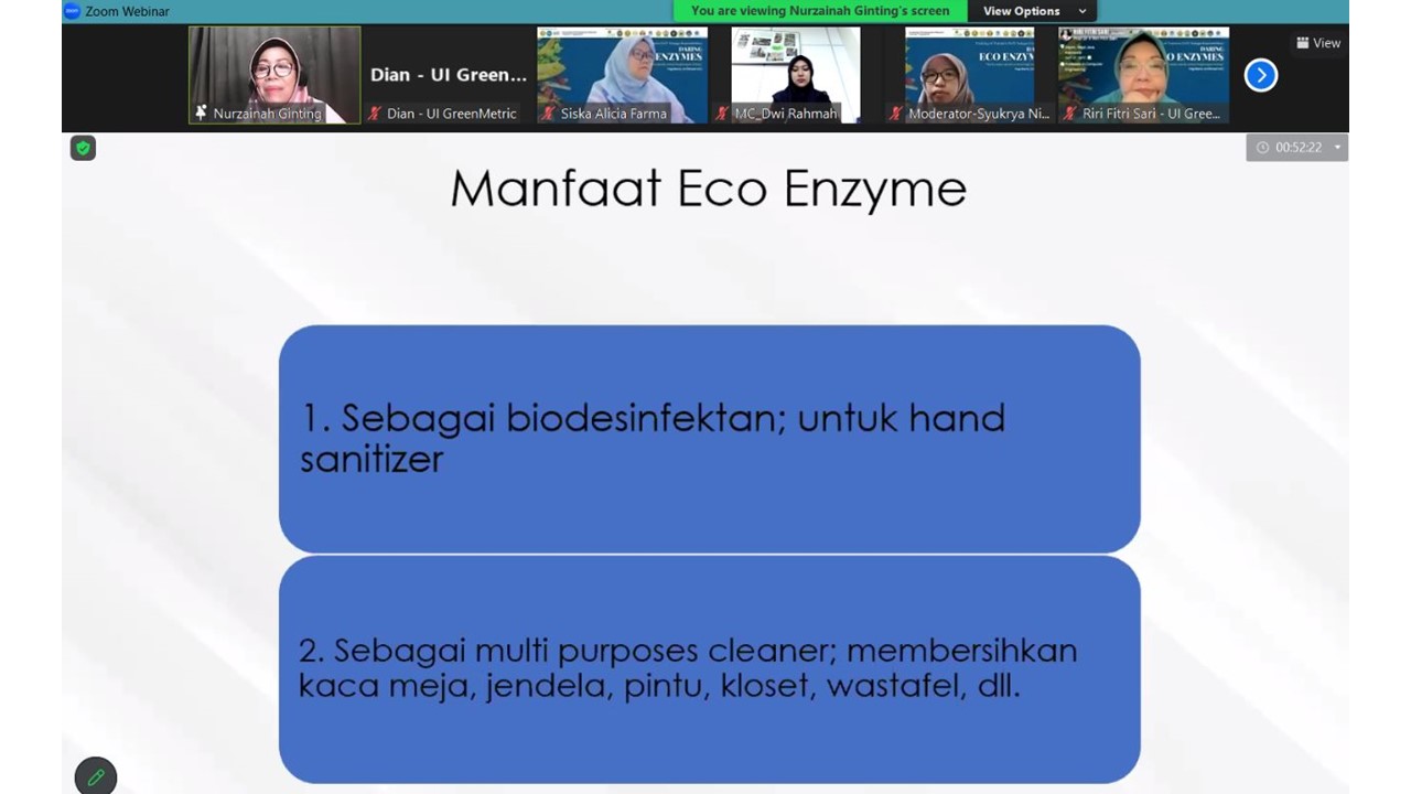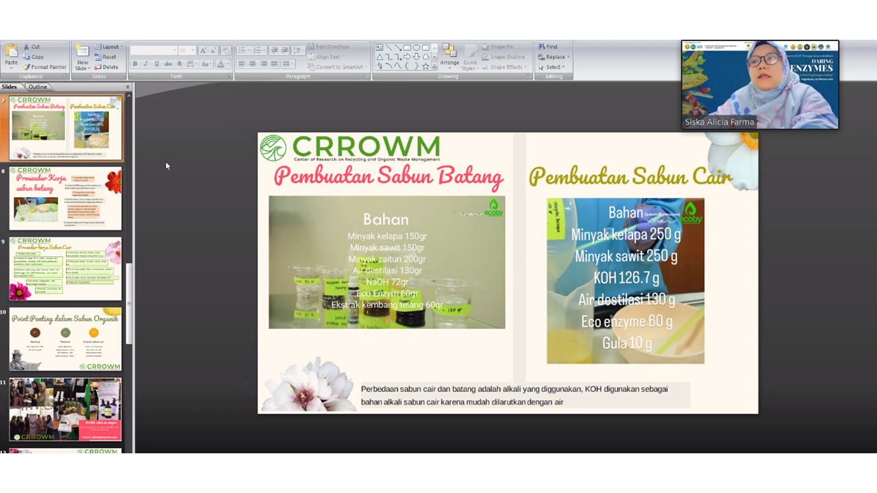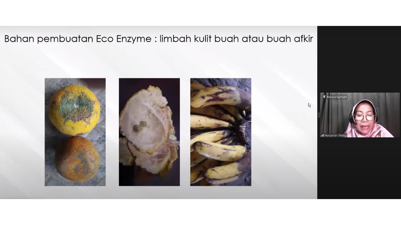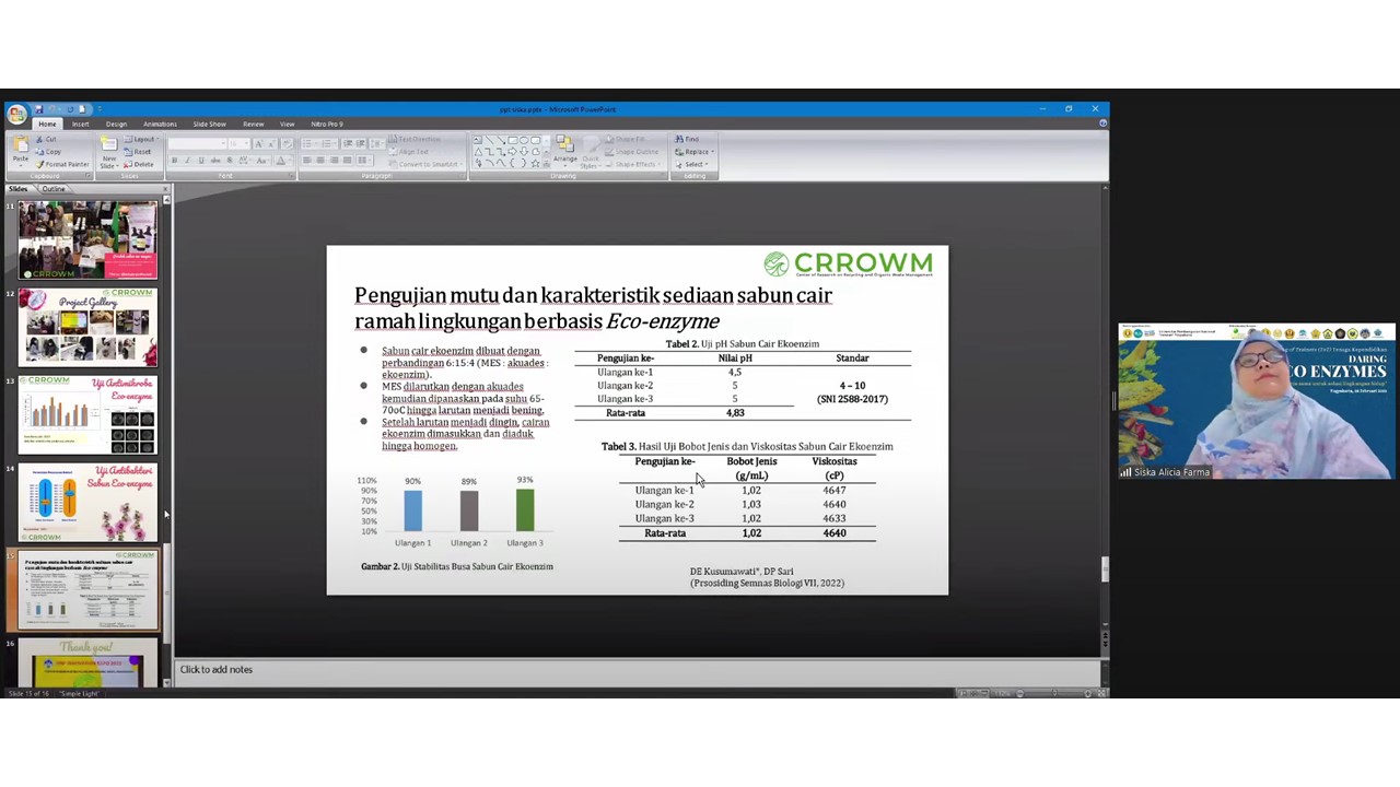 The second speaker, Siska Alicia Farma, S.Pd., M.Biomed presented about The Production of Soap and Disinfectant Based On Eco-Enzyme. She explained the urgency of Eco-Enzyme used on soap and also the benefits, processes and materials for eco-enzyme soap and disinfectant. She also shared her research about antibacterial testing of eco-enzyme soap and quality testing and characterization of environmentally friendly liquid soap formulations based on eco-enzyme.