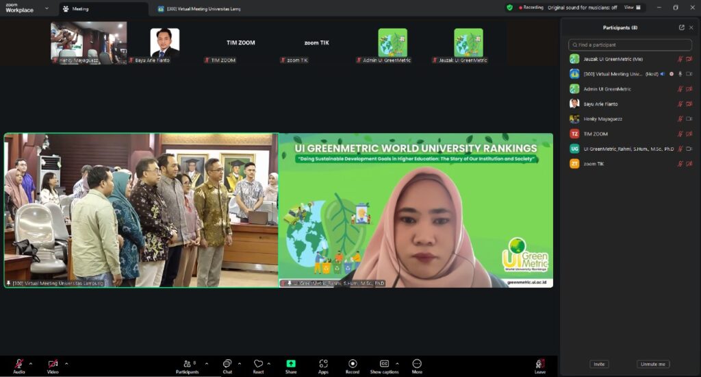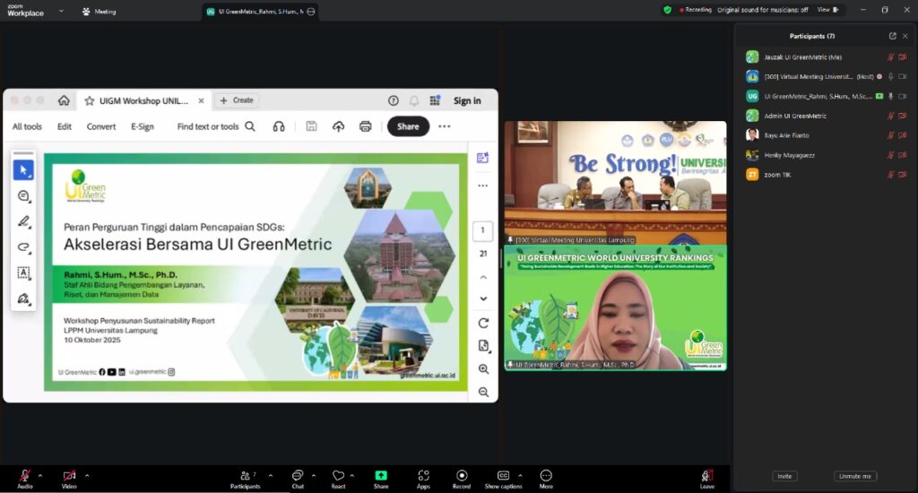 17 October 2025, Bandar Lampung — Universitas Lampung (UNILA) hosted a hybrid workshop titled “Developing Sustainability Reports in Higher Education Institutions to Support SDGs Achievement,” in collaboration with UI GreenMetric World University Rankings. The event aimed to strengthen the capacity of universities in preparing sustainability reports that align with the Sustainable Development Goals (SDGs) and promote institutional accountability in sustainable development.