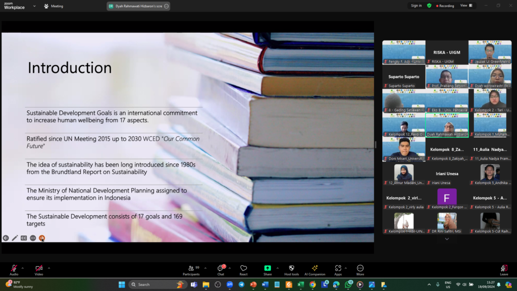 The highlight of the first week was a session on the Introduction to Sustainable Development Goals, presented by Dr. Dyah Rahmawati Hizbaron from Universitas Gadjah Mada. She discussed the SDGs from a geographical perspective, stressing the necessity of sustainable practices to meet the demands of a growing global population. Dr. Dyah also underscored the importance of ongoing research and learning in tackling sustainability challenges.