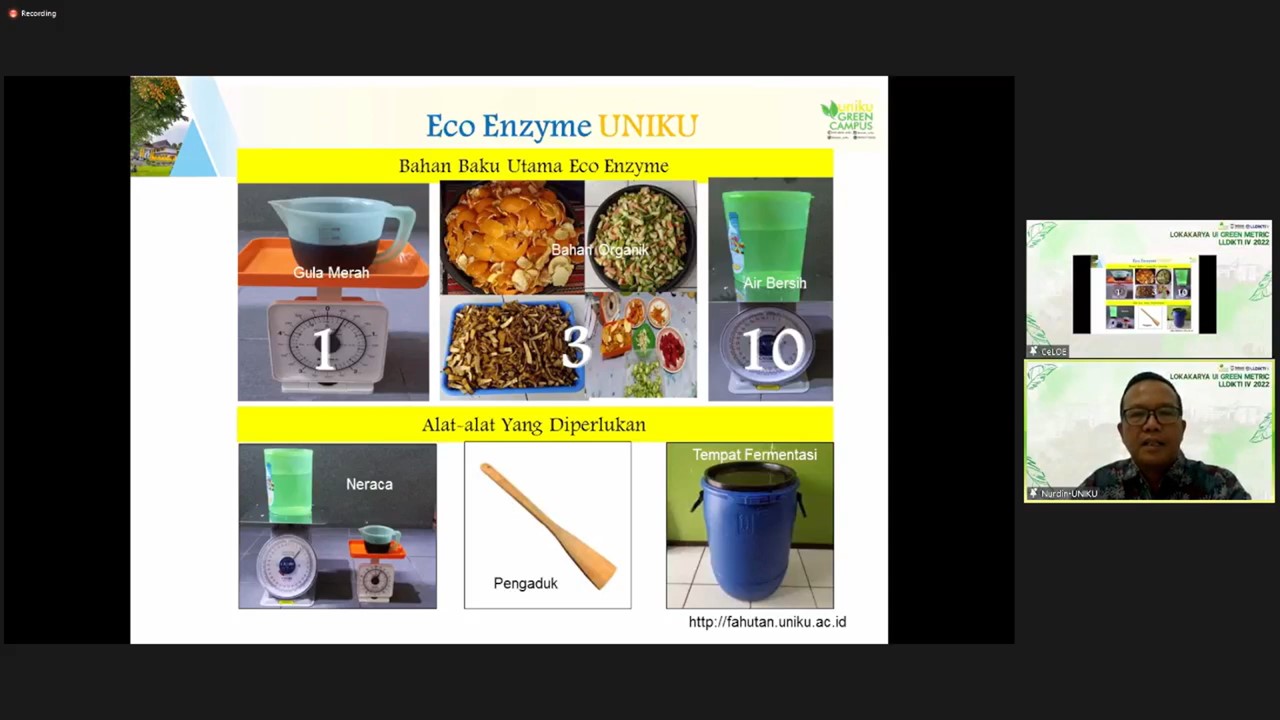 The first speaker of the second session was Dr. Eng. Beta Paramita, S.T., M.T., from Universitas Pendidikan Indonesia that explained Energy Utilization and Management and Climate Change. Then, Mr. Nurdin, M.Si., Secretary of the Environmental Science Program from Universitas Kuningan explained Eco enzymes as an Alternative to the use of Organic Materials.