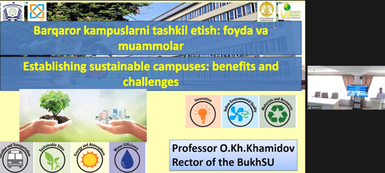 The forthcoming presentation will be given by Professor O.Kh.Khadimov, who is a highly respected figure in the academic community and currently serves as the esteemed Rector of Bukhara State University. The presentation's main topic is centered around "Establishing Sustainable Campuses: Benefits and Challenges" and explores how this relates to UI GreenMetric. The presentation provides valuable insights and encourages thoughtful discussion on the significance of sustainability in campus settings.