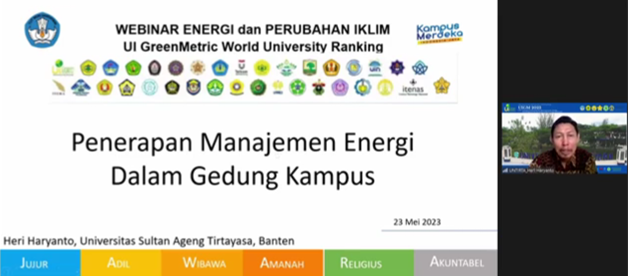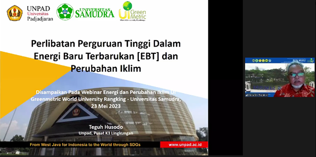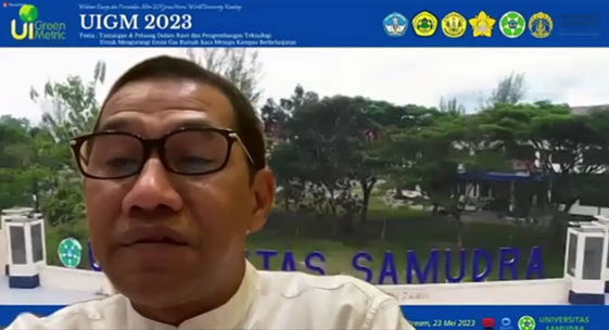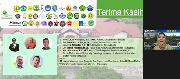 The energy and climate change webinar hosted by Universitas Samudra (UNSAM) took place on Tuesday, June 23, 2023, at 14:00 WIB. The event commenced with an engaging video profile showcasing UI GreenMetric's Universitas Samudra, highlighting their sustainable initiatives. This was followed by opening remarks from Lely Mastura, S.T., M.Eng., Head of Energy and Climate Change at Universitas Samudra, and Prof. Dr. Ir. Riri Fitri Sari, M.M., M.Sc., Chairperson of UI GreenMetric World University Rankings, and Rector of UNSAM, s