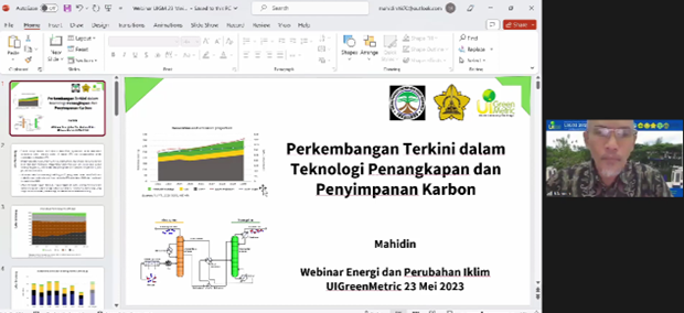 Following the opening remarks from the esteemed leaders of UNSAM and UI GreenMetric, Beni Al Fajar, S.Pd., M.Sc., from UNSAM, took over as the moderator for the webinar. He introduced each speaker, starting with Prof. Dr. Mahidin, S.T., M.T., from Universitas Syiah Kuala (USK), who presented on Recent Developments in Carbon Capture and Storage Technology. Prof. Mahidin provided a comprehensive overview of the Indonesian primary energy mix, investment allocation in the energy sector, and the advantages and disadvantages of carbon capture technology from the exhaust gas.