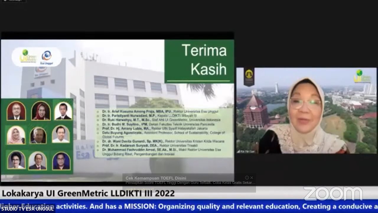 UI GreenMetric and Universitas Esa Unggul has successfully held the Workshop on UI GreenMetric World University Rankings for Universities in LLDIKTI III on Monday, 5 September 2022. This workshop brought up the topic of “Collective actions for Transforming Sustainable Universities in the Post-Pandemic Time”. This event was conducted online through Zoom meeting and a live streaming via Universitas Esa Unggul YouTube Channel which can be accessed at the following link Lokakarya LLDIKTI UI Greenmetric - YouTube. This event was opened with remarks from important figures including: